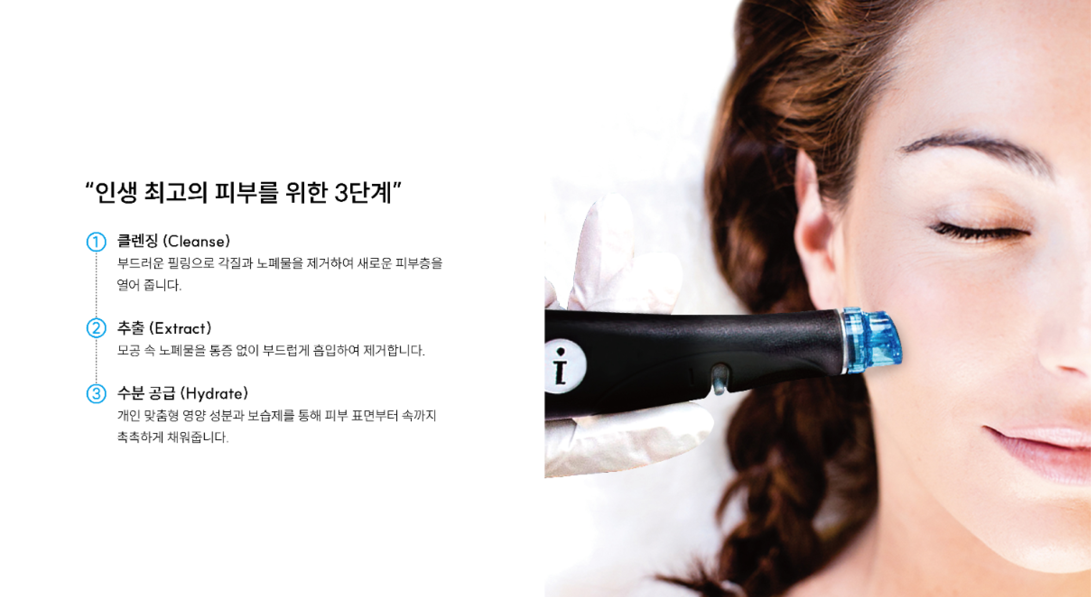 글루코사민염 및 락틱산으로 피부 표면의 피지와 노폐물을 연화시킨 후, 블루팁으로 물리적인 박피를 거칩니다. 이후, 살리실산으로 모공 속 피부를 부드럽게 하여 피지와 노폐물을 흡입합니다. 이때 보습성분을 더해 피부 자극을 완화합니다. 마지막으로 항산화성분, 펩타이드성분을 침투시켜 피부에 광채를 주고 외부 자극으로부터 피부를 보호합니다.